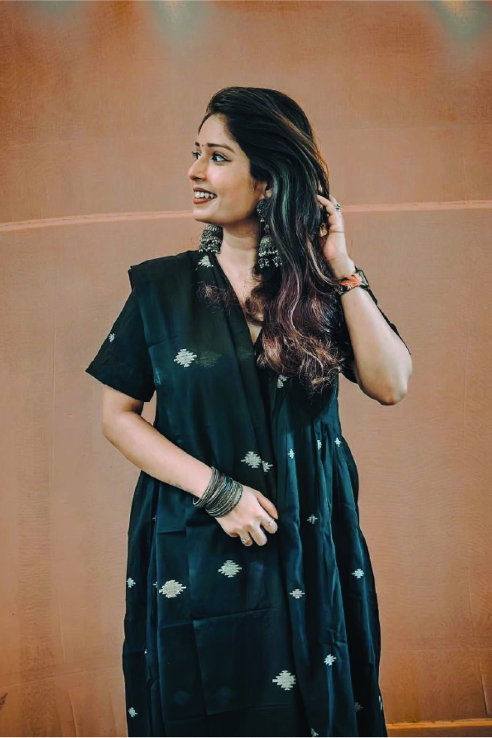 View Product - Handloom Black Pure Cotton Jamdani Flared Kurta Set With Dupatta