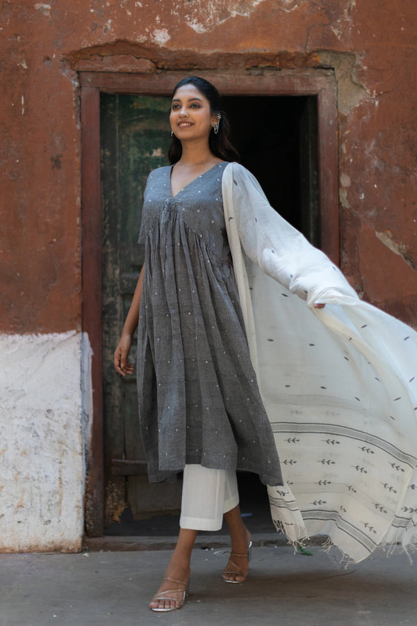 View Product - Handloom Black Pure Cotton Jamdani Flared Kurta Set With Dupatta