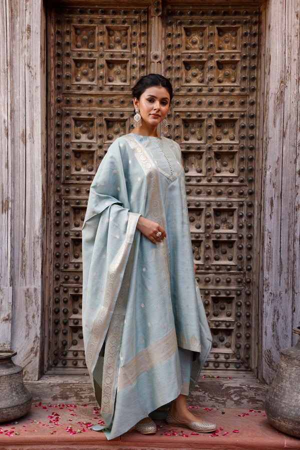Powder Blue Pure Silk Banarasi Kurta Set With Dupatta