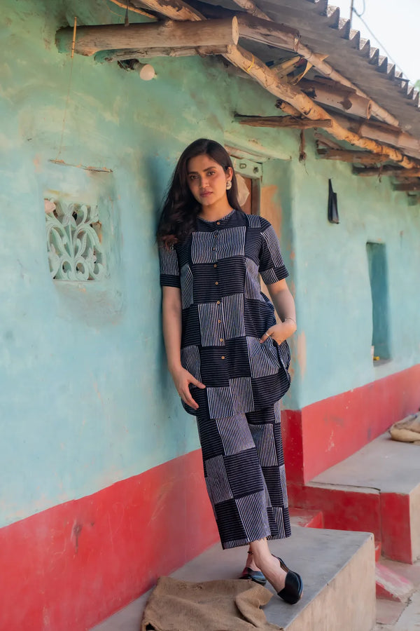 Black Check Stripes Pure Cotton Hand Block Print Co-ord Set