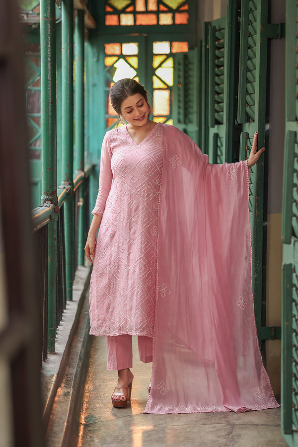 Pastel Pink Mul Chanderi Hand Knotted Bandhani Kurta Set With Dupatta