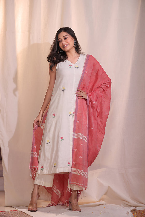 Handloom Off White Pure Cotton Jamdani Flower Kurta Set With Dupatta
