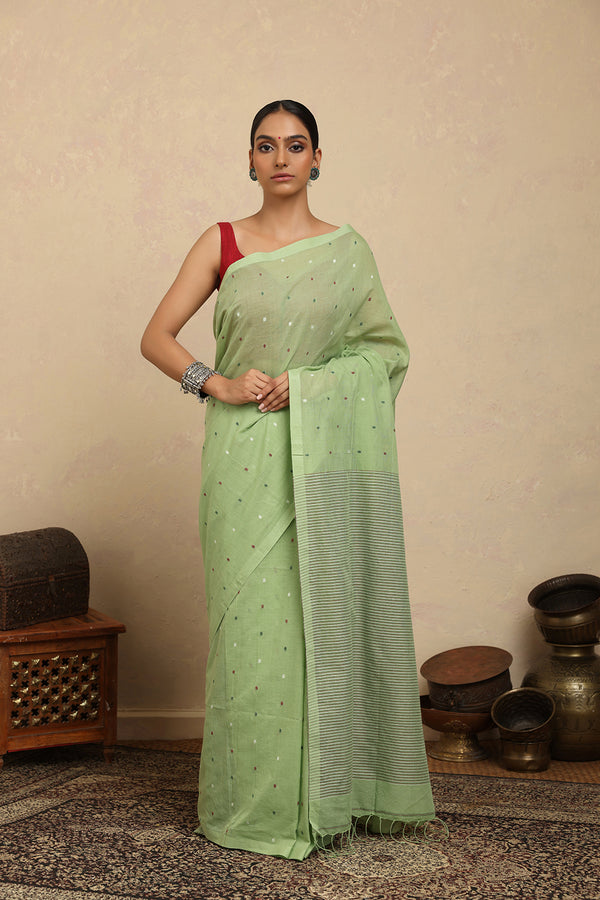 Handloom Green Polka Pure Cotton Jamdani Saree