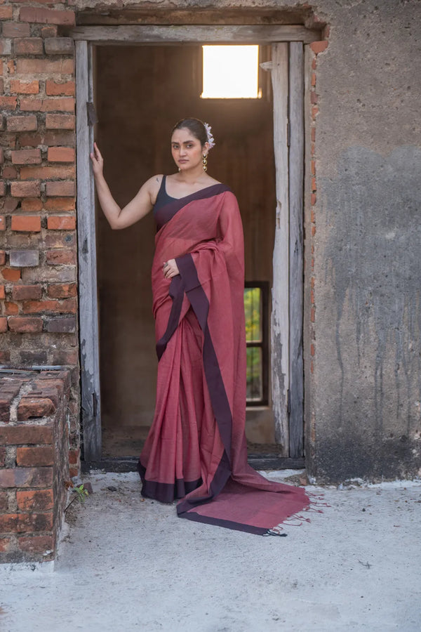 Handloom Brick Red Pure Cotton Saree with Black Border